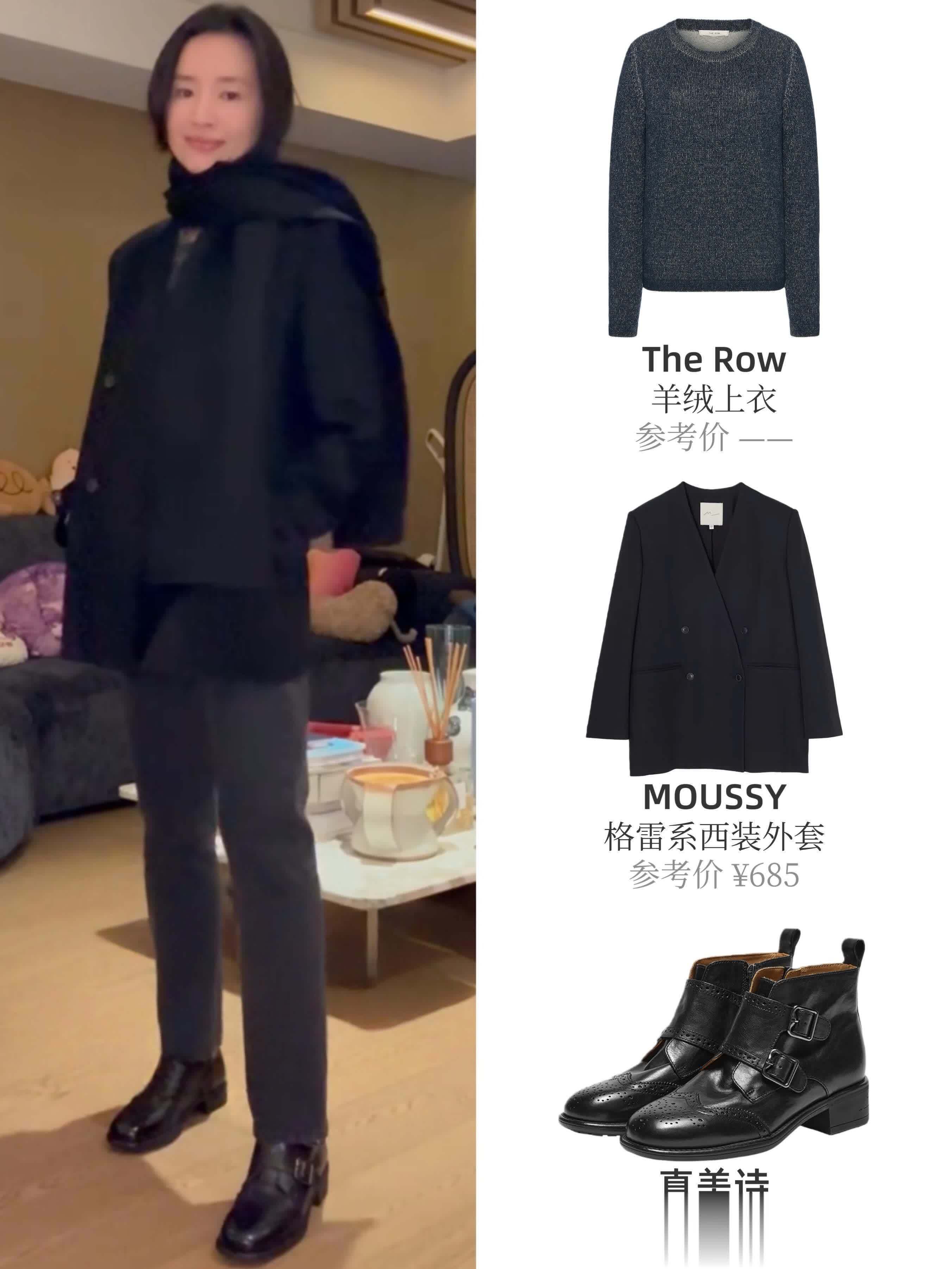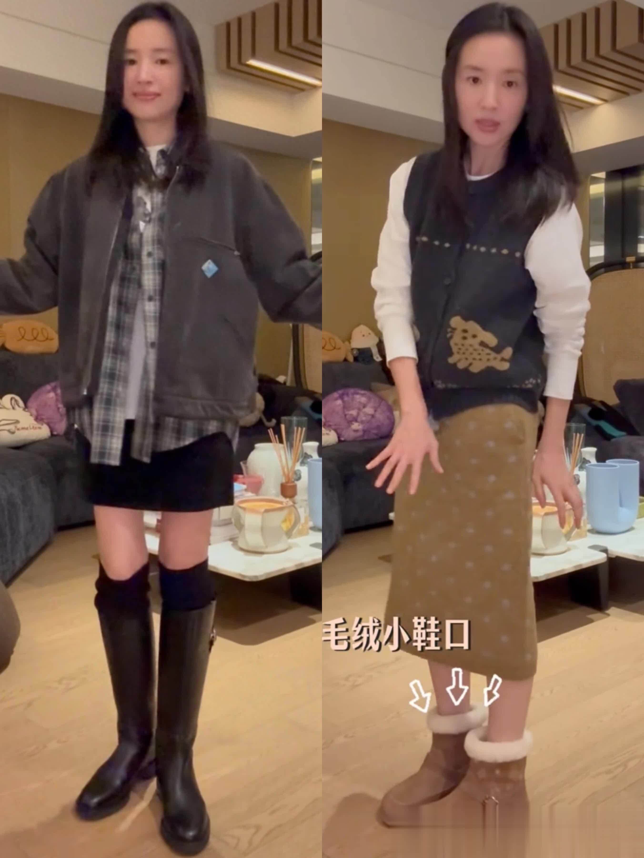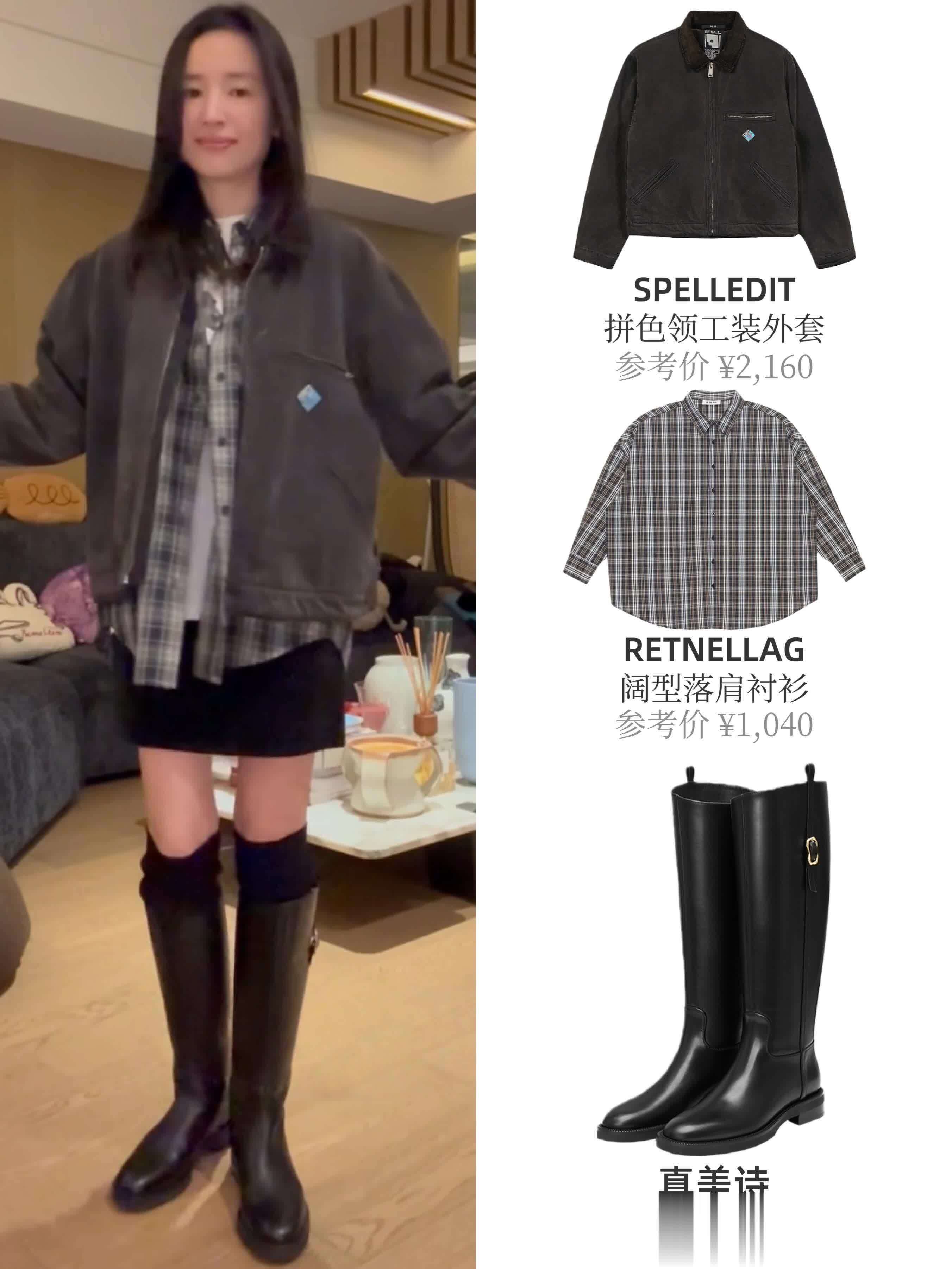 工装外套那套直接把比例拉成“三七分”!卡其色工装外套是短款的,版型有点硬挺但不压肩,里面叠穿了件红绿格纹衬衫,衬衫领口和下摆都露出来一点,瞬间中和了工装的硬朗。下半身看不清具体穿了啥,但光看腿就知道是“小心机”——长筒靴直接拉到大腿根,靴筒紧紧裹着小腿,显得腿又细又直,视觉上把腿长拉到腰,160穿出170的既视感。董洁把外套下摆塞进裤子(或者靴子里),腰线上提了一大截,配上格纹衬衫的复古调,酷飒中带着点慵懒,去逛市集或者看展穿,回头率绝对高,完全不像“明星摆拍”,更像和朋友逛街随手拍的生图。